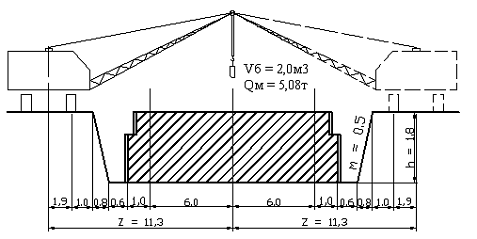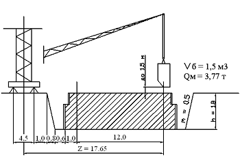 Определив вылет, необходимо выбрать бадью (бадьи выбираем разные: если с рельсовым краном, принимаем Vб = 1,0 м3, с самоходным принимаем Vб = 1,5 м3). Определив вылет Zм и приняв объем бадьи Vб с монтажной массой Qм подбираем по справочным данным необходимый кран, который на вылете Zм может поднять Qм (т).