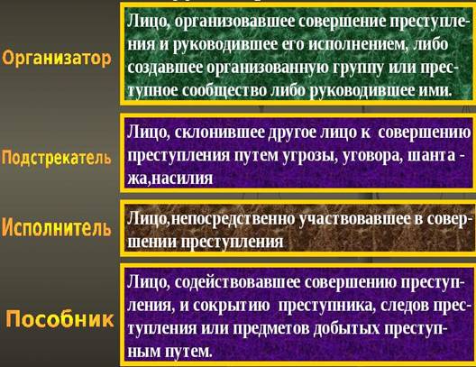 Действующее уголовное законодательство, выбрав в качестве критерия разграничения соучастников их объективную роль в соучастии, т. е. характер участия в совершении преступления, выделяет следующие виды соучастников: исполнитель, организатор, подстрекатель и пособник.