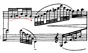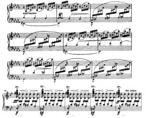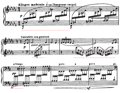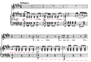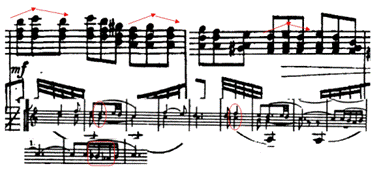 ориентальный характер музыки: в правой руке идёт нисходящий аккордовый пассаж,