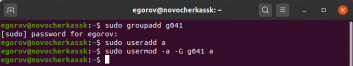 2. Создать группу пользователей с именем g **1 и пользователя с именем a в этой группе, используя режим командной строки.