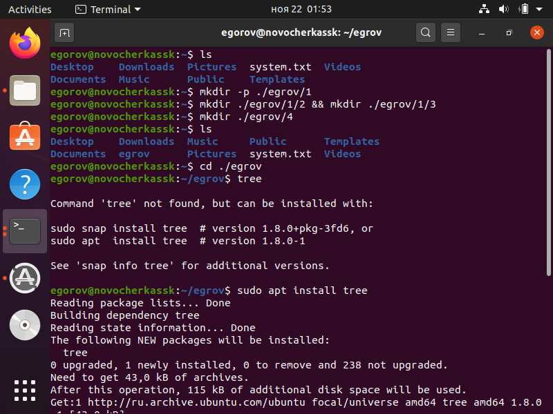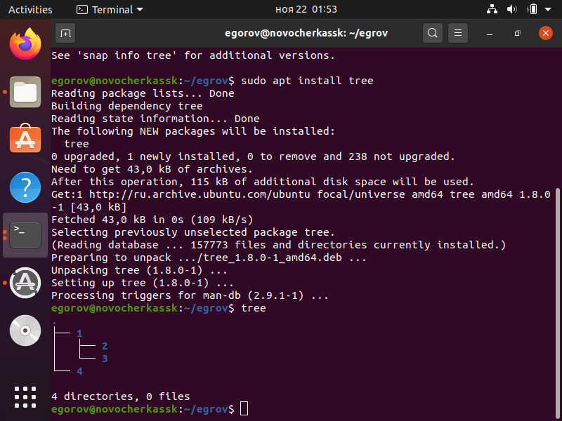 В домашнем каталоге, как и в любом другом, можно создавать сколько угодно подкаталогов, в них - свои подкаталоги и т. д. Иными словами, пользователю принадлежит фрагмент (поддерево) файловой системы, корнем которого является его домашний каталог. Чтобы организовать такое поддерево, потребуется создать каталоги внутри домашнего. Для этого используется утилита mkdir. Она применяется с одним обязательным параметром: именем создаваемого каталога. По умолчанию каталог будет создан в текущем каталоге.