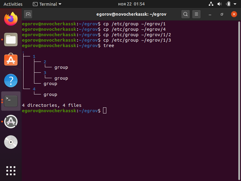 7. Скопировать файл /etc/group в каталоги 1, 2, 3 и 4 используя абсолютные имена копируемого файла и каталога назначения.
