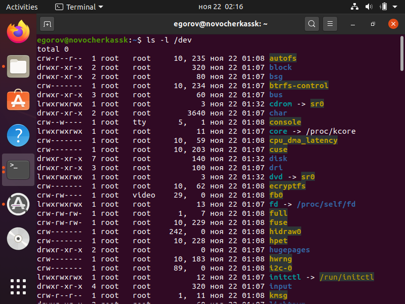 9. Выполнить команду ls –l /dev используя таблицу обозначений типов файлов, перечислить типы файлов, хранящихся в каталоге /dev.