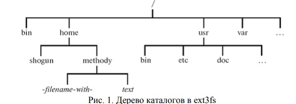 Структуру файловой системы можно представить наглядно в виде дерева, "корнем" которого является корневой каталог, а в вершинах расположены все остальные каталоги. На рис. 1 изображено дерево каталогов, курсивом обозначены имена файлов, прямым начертанием - имена каталогов.