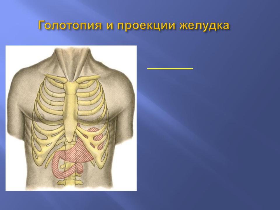 На переднюю брюшную стенку большая часть желудка проецируется - в левом подреберье, меньшая - в собственно надчревной области.