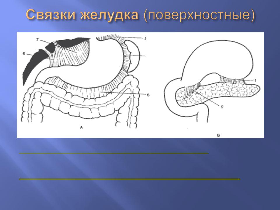 (3). Желудочно-диафрагмальная связка, lig. gastrophrenicum. переходит с диафрагмы на дно желудка.