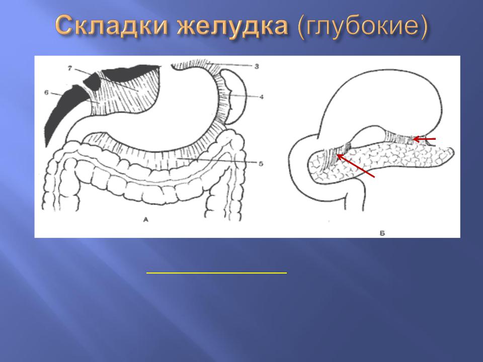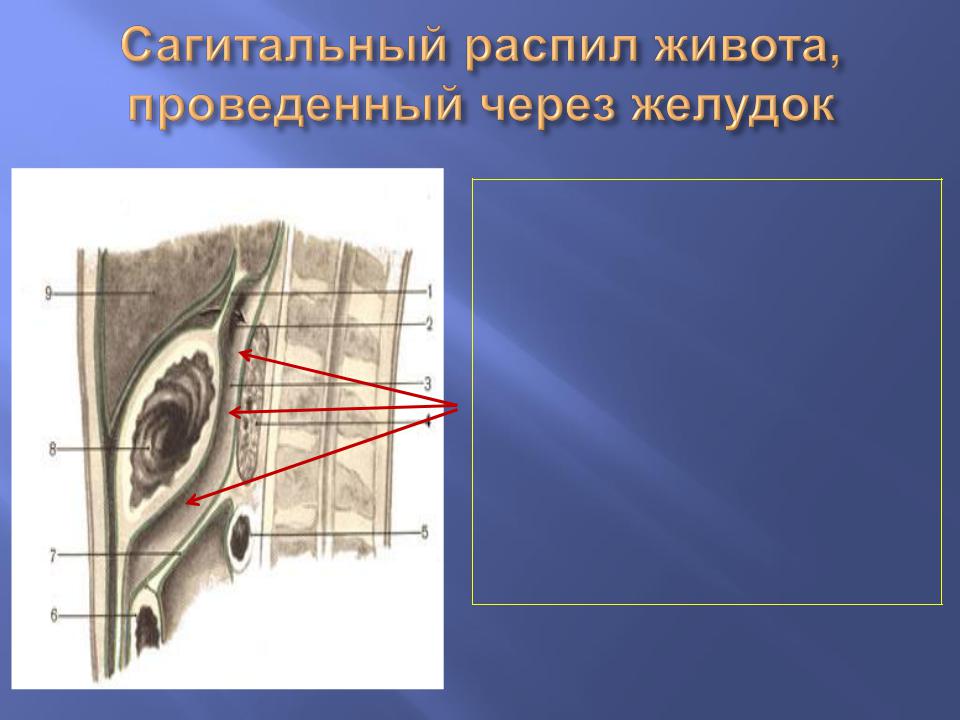 Под гастропанкреатической складкой проходят левые желудочные сосуды, a. et v. gastricae sinistrae, и чревная ветвь п. vagus.