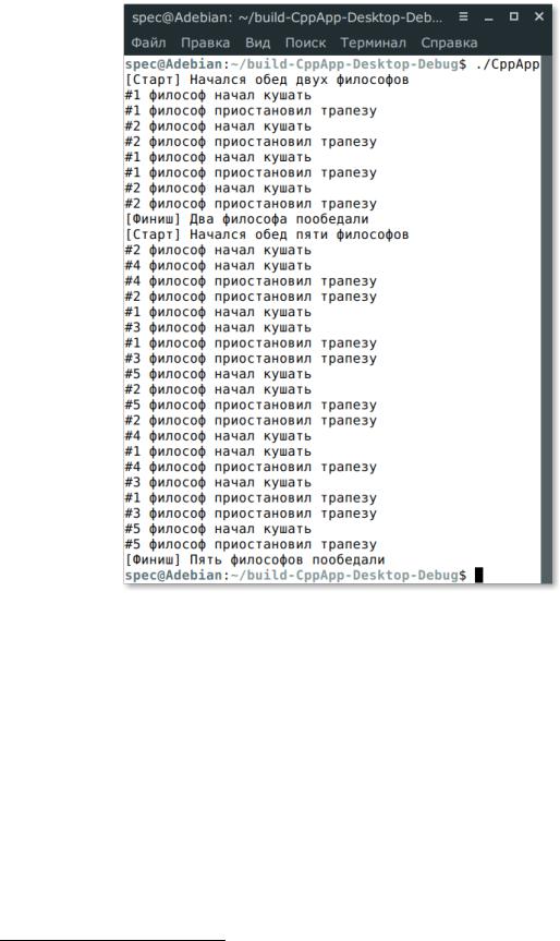Рисунок 5 — Работа алгоритма решения задачи об обедающих философах В данном случае мы использовали C++, а не Си, так как задача лежит