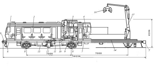 имеет автосцепку 5, путеочиститель 6 и опирается на три приводные колесные пары