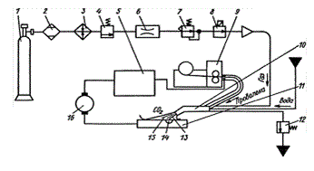 расходомер; 7 - регулятор давления; 8 - электромагнитный клапан; 9 - механизм