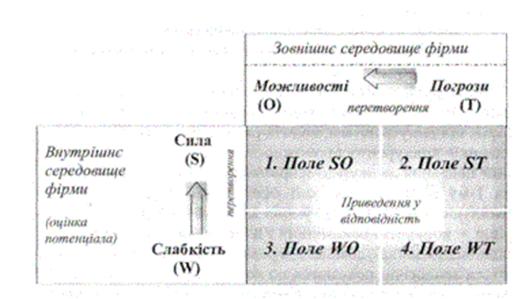Сутність матриці SWOT полягає у тому, що вона дає змогу завдяки різноманітним комбінаціям сильних та слабких сторін, можливостей та загроз формувати оптимальну стратегію фірми згідно з умовами ринкового середовища.