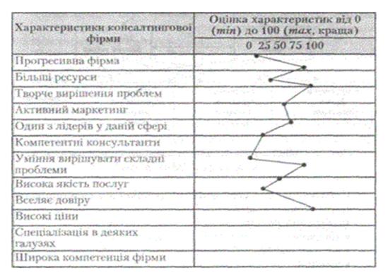 У табл. 1.3. подано приклад набору характеристик для аналізу якості консультаційних послуг у сфері менеджменту.