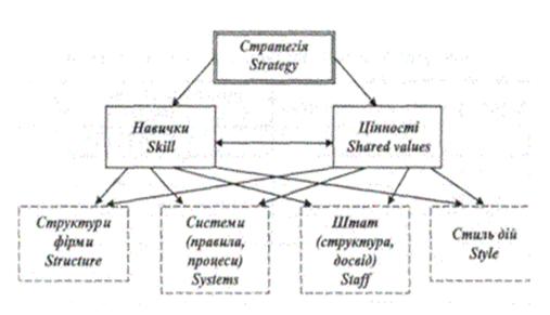 Модель аналізу "Мак-Кінзі" включає сім факторів, сім слів, що починаються в англійській мові буквою «S» (strategy - стратегія, skill - навички, shared values - загальновизнані цінності, structure - структура, systems - системи, staff - кадри, style - стиль).