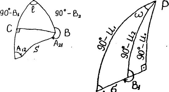 Оберненою головною геодезичною задачею називається визначення віддалі S і азимутів А12 та А21 по відомим координатам двох пунктів В1, L1 і