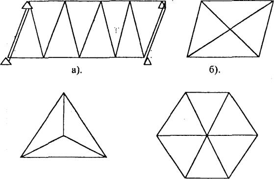 Рис.1.2.Типові фігури тріангуляції: а-ряд трикутників; б-геодезичний чотирикутник; в-вставка пункта в трикутник; г-центральна система. Метод полігонометрії-прокладають на місцевості системи полігонів або
