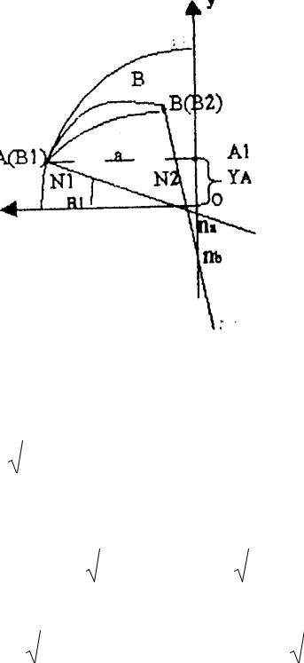 Приведем нормаль na до точки А, яка знаходиться на поверхні еліпсоїда. Приведем нормальний переріз з точки Ав точку В. Сумістимо з малою віссю обертання вісь у. Друга координатна лінія буде суміщена з другою піввіссю. OA1 = YA