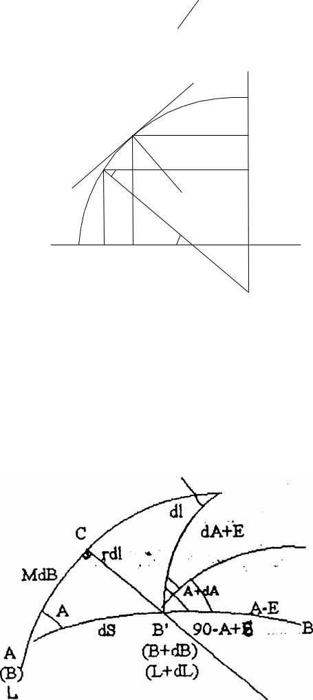 Розглянем сфероїдальний трикутник, утворений меридіаном точки А, елементом dS геодезичної лінії з точки А на точку В і меридіаном точки В'. В точці В' проведем елемент паралелі і одержим точку С. А—азимут геодезичної лінії.