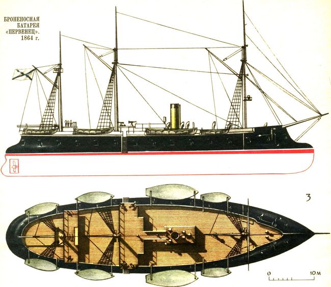 К 1860-м годам стало ясно, что броня, в мгновение ока уничтожившая строгую, выработанную столетиями классификацию парусных кораблей, привела к появлению броненосцев, для которых требуется своя, новая классификация. Русское морское ведомство решило для плавания в океанах и линейного боя оставить бортовые броненосцы с полным парусным вооружением и с броней умеренной толщины, а для атаки и обороны портов и гаваней строить броненосцы береговой обороны, способные нести самые тяжелые орудия и самую толстую броню. Поскольку первостепенной задачей для России была защита берегов, основной упор кораблестроительной программы делался на броненосцы береговой обороны. Постройка в 1861 году небольшой броненосной лодки «Опыт» показала» что заводы царской России не в состоянии были выполнить требования морского ведомства. Поэтому первый русский броненосец — плавучая батарея «Первенец» — сооружался в Англия. Ее строительство было использовано для обучения русских инженеров и мастеров, командированных с этой целью в Англию. Следующая броненосная батарея «Не тронь меня» строилась уже в Петербурге, на Галерном островке, английским заводчиком Митчеллом, но силами русских рабочих под наблюдением инженера Соболева. Третью батарею — «Кремль», несколько увеличенного водоизмещения — построили на русском частном заводе Семяиникова и Полетики частью из английского, частью из русского железа. Из двух систем постройки — французской, при которой деревянный корпус обшивали коваными железными плитами, и английской, при которой корпус строился из железа, предпочтение отдавалось английской, хотя она была дороже и требовала больше времени. На русских верфях было построено всего два панцирных броненосца (переделанные фрегаты «Севастополь» и «Петропавловск»). Все остальные строились из железа, ибо морское ведомство считало: «Железное судостроение должно прочно водвориться в России, суда должны строиться русскими и из русских материалов, чтобы нам не быть в этом важном деле в зависимости от иноземной промышленности и иностранных техников». В результате этой дальновидной политики уже в 1864 году отечественное судостроение смогло приступить к постройке нашего первого мореходного броненосца — казематного фрегата «Князь Пожарский». Он строился на Галерном островке целиком из русского железа, а на изготовление каземата пошла первая броня Ижорского завода. Пробные плавания в Балтийском море в 1869, 1870 и 1871 годах дали малоудовлетворительные результаты, и это обстоятельство позволило знаменитому нашему кораблестроителю адмиралу А. Попову лишний раз блеснуть своим талантом. Проведя испытания, он убедился, что недостатки фрегата кроются не в конструкции его, а в неправильном размещении грузов и рангоута. Произведенные по указаниям А. Попова переделки дали прекрасные результаты, и летом 1873 года «Князь Пожарский», успешно перенеся ряд штормов, отправился нести службу в Средиземное море. Он стал нашим первым броненосцем, вышедшим из Кронштадта за пределы Балтийского моря.