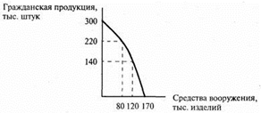Допустим, на машиностроительных заводах выпускается продукция: а) для гражданских нужд (легковые автомобили, холодильники, пылесосы и т. п.) и б) для армии (танки, ракеты и др.). Правительство и владельцы машиностроительных предприятий, учитывая изменившийся спрос, должны решить, как полнее использовать производственные ресурсы. По варианту, рассчитанному на случай войны, все факторы производства будут применены для изготовления средств вооружения в количестве 170 тыс. штук. Другой вариант (при мирных условиях) предусматривает выпуск гражданской продукции - 300 тыс. изделий. Возможный выбор иных вариантов наглядно отражает шкала производственных возможностей (табл. 1).Она показывает, сколько разных благ можно создать при полном использовании ресурсов.