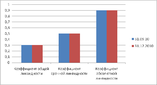 Коэффициент общей ликвидности (коэффициент текущей ликвидности), характеризующий общую обеспеченность предприятия оборотными средствами для ведения хозяйственной деятельности и своевременного погашения срочных (текущих) обязательств предприятия, в рассматриваемом периоде остался не низменным 0,3 . Коэффициент срочной ликвидности, отражающий долю текущих обязательств, покрываемых за счет денежных средств и реализации краткосрочных ценных бумаг, в анализируемом периоде тоже остался без изменений и составил в обоих кварталах 0,5. Коэффициент абсолютной ликвидности, отражающий долю текущих обязательств,