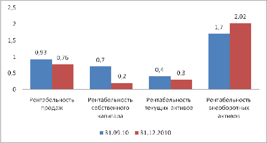 Коэффициент автономии (финансовой независимости), определяющий степень независимости предприятия от внешних источников финансирования и характеризующий долю собственных средств в балансе, увеличился в анализируемом периоде с 0,004 и до 0,1. Увеличение коэффициента говорит о повышении финансовой независимости предприятия. Рентабельность продаж, отражающая долю чистой прибыли в объеме продаж,за анализируемый период уменьшилась на 0,2%. Рентабельность собственного капитала предприятия, определяющая эффективность использования вложенных в предприятие средств уменьшилась, что является отрицательным фактом, и составила -0,5%. Рентабельность текущих активов (отражающая эффективность использования оборотных активов и показывающая, какую прибыль приносит единица оборотного капитал предприятия) уменьшилась, что является отрицательной тенденцией, и составила -0,1%. Рентабельность внеоборотных активов (отражающая эффективность