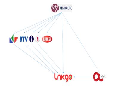 Крупнейшему литовскому концерну «MG Baltic» принадлежат не только предприятия, производящие алкогольную продукцию («Stumbras», «Alita», «Anykščių vynas»), продающие одежду («Aprangos grupė») и недвижимость («MG Valda»), но и две медиакомпании - группа «LNK» и «Alfa media» (портал alfa.lt). Последняя полностью принадлежит дочерней компании концерна «MG Baltic Media». Также ей принадлежат 80% акций группы «LNK», в которую входят телеканалы «LNK», «BTV», «TV1», «Info TV» и «LIUKS!» (см. Рис. 4). Кроме того, компании «MG Baltic Media» принадлежит 11053 акций компании «UPG Baltic», выпускающей 42 журнала, в основном, с кроссвордами, а также журналы для мужчин («Playboy», «Tik vyrams», «A-Zet» и пр.).