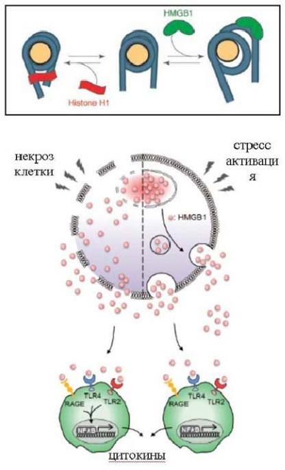 HMGB-1 приобретает функции DAMP (нижняя часть рисунка), когда он оказывается во внеклеточном пространстве и становится доступным для рецепторов врождённого иммунитета на других клетках. Высвобождение HMGB-1 может происходить при некрозе и апоптозе клетки, а также путём активной секреции из макрофага при его активации LPS или провоспалительными цитокина-