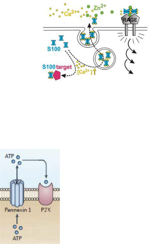 Некоторые белки S100 становятся DAMPs, когда секретируются во внеклеточное пространство, связывают ионы Zn2+, димеризуются и взаимодействуют с соответствующим клеточным рецептором врождённого иммунитета, в данном случае с RAGE, от которого в клетку поступает активи-