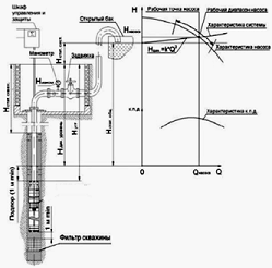 Рис.1. схема установки скважинного электронасосного агрегата и совместной характеристики агрегата и системы.