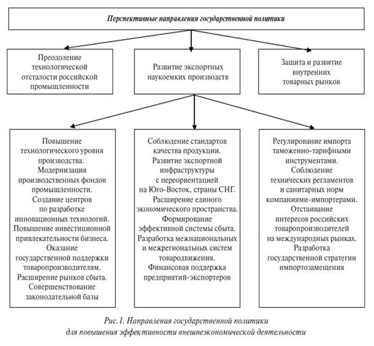 Обобщая вышеизложенное, можно сказать, что для эффективного развития международной торговли в России на данный момент первоочередной является задача превращения Российской Федерации в государство, производящее и продающее конкурентоспособную продукцию, установления равнозначных условий конкуренции между предприятиями, относящимися к разным секторам рынка (6). Основным условием решения данной проблемы можно назвать эффективную политику государства в отношении внешнеэкономической деятельности, которая должна базироваться на усилении функций государственного регулирования внешней торговли; на ужесточении контроля качества и количества ввозимых и вывозимых товаров; активном привлечении инвестиций иностранных партнеров; формировании оптимальных условий деятельности отечественных экспортеров; государственной поддержке развития экспортно-ориентированных наукоемких производственных отраслей и сельского хозяйства.