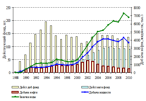 Месторождение до 2003 г. находилось в стадии растущей добычи нефти,