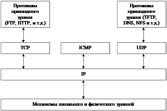 Следующий уровень (уровень II) называется основным. На этом уровне функционируют протокол управления передачей TCP (Transmission Control Protocol) и протокол дейтаграмм пользователя UDP (User Datagram Protocol). Протокол TCP обеспечивает надежную передачу сообщений между удаленными прикладными процессами за счет образования виртуальных соединений. Протокол UDP обеспечивает передачу прикладных пакетов дейтаграммным способом, как и IP, и выполняет только функции связующего звена между сетевым протоколом и многочисленными прикладными процессами.