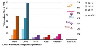 Рисунок 4. Размер ВВП и темпы его рост по странам, прогноз до 2040 года.