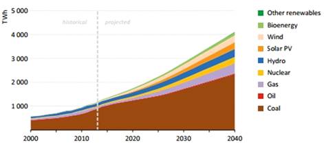 В то же время, согласно прогнозам международного агентства по энергетике (См.: Рисунок 6), в Индии будет расти доля возобновляемых источников энергии. В то же время, доля традиционных не возобновляемых источников будет также постепенно возрастать.