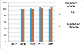 Таблица 7. Сравнение интенсивности изменения числа действующих организаций по предприятиям отрасли ПЭО Кировской области и РФ за 2007-2011 годы