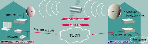 Спутник охватывает большую зону на поверхности Земли и является наиболее "широко охватывающей" технологией доступа в Интернет с географической точки зрения. Спутниковые системы доступа имеют не очень высокую скорость передачи данных (порядка 400 Кбит/с по направлению к пользователю) и работают не очень быстро. Представьте себе, что вы хотите загрузить какой-либо материал на экран вашего компьютера. Щелкнув на него мышью своего компьютера, вы подали сигнал запроса, который должен пройти по вашей телефонной линии, через провайдера и по обычному тракту в сети Интернет, а после ответа сигнал передается на спутник вверх и вниз, что в общей сложности составляет около 70 тысяч километров. Даже обладая скоростью света, данное средство доступа в Интернет остается достаточно медленным. Это особенно заметно при осуществлении двусторонней связи в режиме реального времени. Несмотря на широкую зону охвата, спутниковые системы имеют ряд недостатков, связанных, в частности, с необходимостью приобретения и настройки достаточно дорогостоящего оборудования. Впрочем, существует целый ряд экстремальных ситуаций, когда невозможно организовать доступ в сеть Интернет никаким другим образом, кроме как через спутник (простой пример - корабль, находящийся посреди океана).