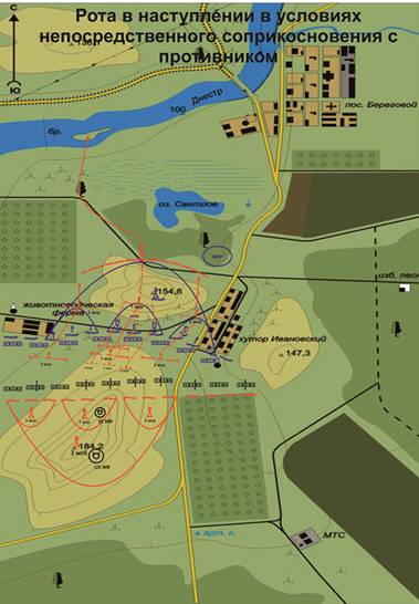 С переходом роты в наступление противник, удерживая район высоты 154.8, будет стремиться не допустить овладения ей и прорыва в направлении леса Приозерный. С овладением рубежом юго-восточный склон высоты 154.8 возможна контратака противника силой до роты в направлении Птицефермы.