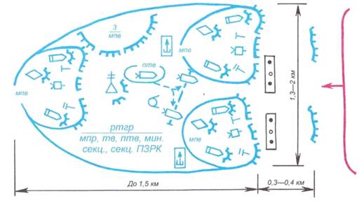 Ротная тактическая группа (мотопехотная, танковая рота) обороняет опорный пункт 1,3-2 км по фронту и до 1,5 км в глубину, строя боевой порядок в один эшелон или в два эшелона (рис. 4.7).