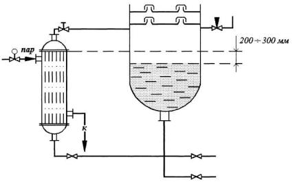 Куб колонны. Кипятильник может быть выносным или встроенным. Трубопроводы, соединяющие выносной кипятильник кубового остатка с колонной, не должны нарушать естественную циркуляцию. Эта циркуляция обеспечивается тем, что кипятильник, обычно установленный вертикально, располагается так, чтобы его верхняя трубная доска была на 200...300 мм выше уровня жидкости в колонне (рис. 5.5).