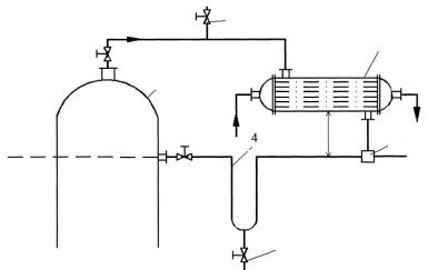Дефлегматор колонны может быть встроенным (парциальным) или выносным. Трубопроводная обвязка выносного дефлегматора зависит от способа подачи флегмы в колонну: самотек или с помощью насоса. В случае самотечной подачи дефлегматор устанавливается на 2...2,5 м выше точки ввода флегмы в колонну (рис. 5.6).