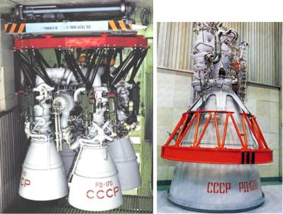 Рис. 4.4. Ракетные двигатели РД-170 и РД-120