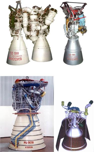 На рис. 4.5 представлены фотографии кислородно-керосиновых ракетных двигателей РД-180 (слева) и РД-191 (справа) разработки НПО «Энергомаш». Эти двигатели разработаны на основе РД-170 и представляют собой как бы разбивку этого двигателя соответственно на две и четыре части с изменёнными турбонасосными агрегатами. Двигатель РД-180 используется в РН «Атлас-5» (США), а РД-191 на РН «Naro» (Южная Корея) и РН «Ангара» (Россия). РД-180 также предполагалось использовать на РБ первой ступени РН «Русь-М».
