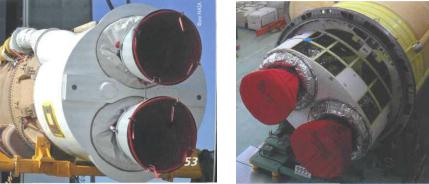 При использовании готовых двигателей компоновка хвостовых отсеков не всегда получается рациональной по критерию наибольшей плотности компоновки. Так, например, на ракетах-носителях, Atlas (США) и H-II B (Япония) используются двухкамерные ракетные двигатели. Хвостовые отсеки этих ракет показаны на рис. 10.11. Причем на РН Atlas используются российские двигатели РД-180. Основная причина применения таких схем заключается в относительно низкой стоимости используемых двигателей.