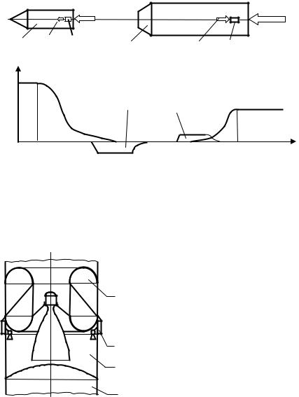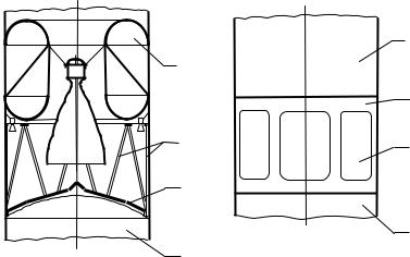 Переходный отсек может быть выполнен в виде ферменной конструкции (рис. 10.24, а) или в виде подкрепленной обечайки с люками (так называемые «вышибные» окна), которые отбрасываются при повышении давления в переходном отсеке (рис. 10.24, б). На этих рисунках введены следующие обозначения: 1 - ракетный блок верхней ступени; 2 - переходный отсек; 3 - ракетный блок нижней ступени; 4 - переходная ферма; 5 - теплозащитный экран; 6 - люки, открывающиеся газами двигателя.