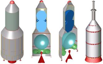 Твердотельные модели ракетных блоков (РБ) разрабатываются на основе использования построенных отсеков ракеты-носителя: баков, сухих отсеков, ферменных конструкций, двигателей с фермами крепления и переходных отсеков с полезной нагрузкой и створками головного обтекателя.