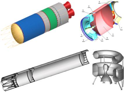 На рис. 15.15 в качестве примера представлены твердотельные модели ракетных блоков (без разреза и с разрезом) различных ступеней РН.