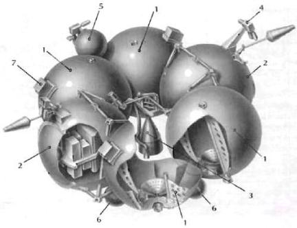 На рисунке введены следующие обозначения: 1- топливные баки; 2 – приборные контейнеры; 3 – двигатель С5-92; 4 – двигатели системы ориентации и обеспечения запуска (СОЗ); 5 - топливные баки СОЗ; 6 –баллоны с гелием; 7 – химическая батарея.