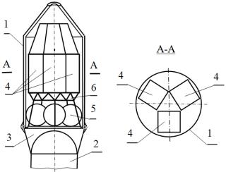 Одна из возможных компоновочных схем полезной нагрузки с разгонным блоком «Фрегат» под головным обтекателем приведена на рис. 16.5, где 1 - головной обтекатель; 2 - верхний бак РН; 3 - переходник; 4 - полезная нагрузка - малогабаритные спутники; 5 - разгонный блок; 6 - ферма для установки полезной нагрузки.