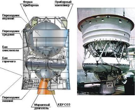 Нагрузка от силового шпангоута разгонного блока к полезной нагрузке передаётся через ферменную конструкцию (адаптер). Приборный контейнер (или приборный отсек в форме тора) установлен над баком окислителя и крепится на элементах ферменных конструкций.