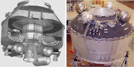 На рис. 16.6 слева показана компоновочная схема блока «ДМ», а справа – фотография этого блока без среднего и нижнего переходников. Особенность компоновочной схемы блока обусловлена формами баков и схемами передачи усилий. Форма бака окислителя в виде сферы выбиралась по соображениям минимальной поверхности испарения жидкого кислорода во время длительных перелётов. Ещё для уменьшения испарения жидкий кислород на блоке «Д» переохлаждался до температуры минус 200 °С. Бак горючего имеет форму тора.